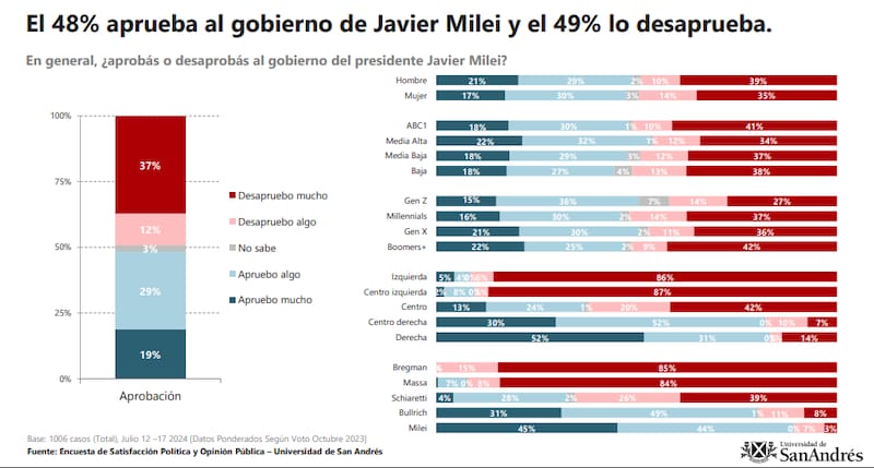 A pesar de estos números de caída, el presidente libertario mantiene los números de aprobación previamente registrados. El 48% aprueba al gobierno de Javier Milei y el 49% lo desaprueba.