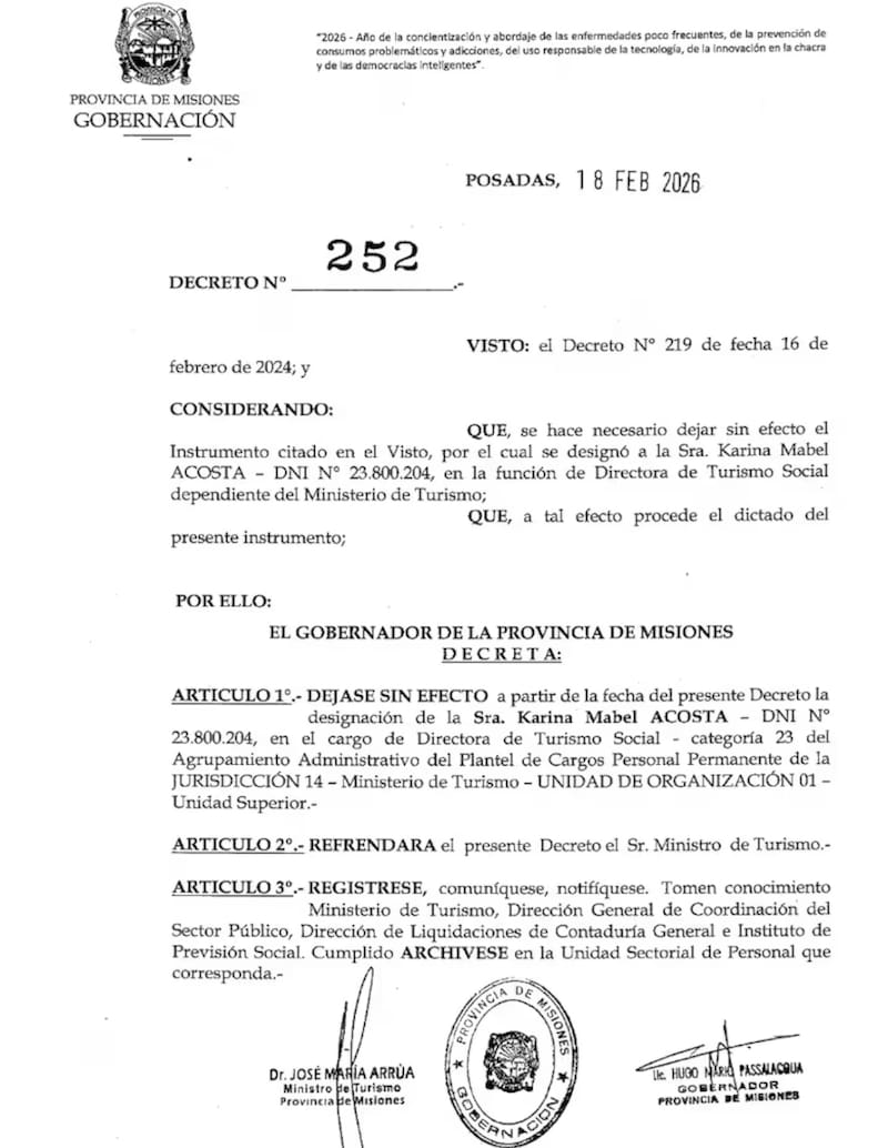 La respuesta del ejecutivo misionero fue rápida y contundente. A través del decreto 252, Passalacqua dispuso la “cesantía inmediata” de Acosta. El documento no explicita los fundamentos de la decisión, pero desde el gobierno provincial aclararon que no habrá tolerancia para ese tipo de actitudes en funcionarios públicos. Además, informaron que el cargo no será cubierto por otra persona: directamente será eliminado del organigrama del ministerio.