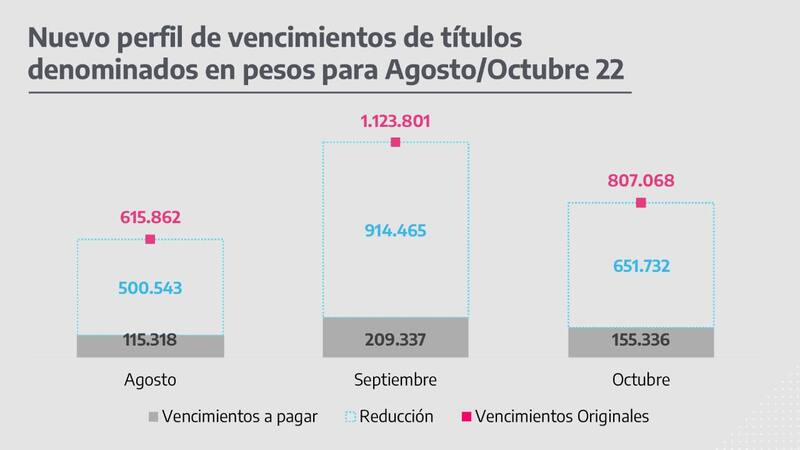 El Tesoro Nacional debía afrontar vencimientos por $ 615.862 millones en agosto, en $ 1.123.801 millones en septiembre y $ 807.068 millones en octubre.
