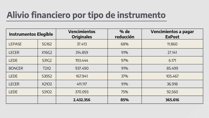 - Opción 3: Un bono en moneda dual con vencimiento el 29 de septiembre de 2023 para los tenedores del LECER X2102 y de la LEDE S31O2, cuyos vencimientos son el 21 y el 31 de octubre de 2022, respectivamente.