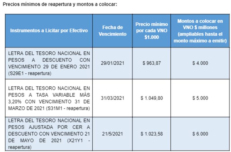- La Ledes, originalmente emitida el 1° de julio, tendrá vencimiento el 29 de enero, con un precio mínimo de reapertura de $ 963,87 por cada $ 1000 nominales.
