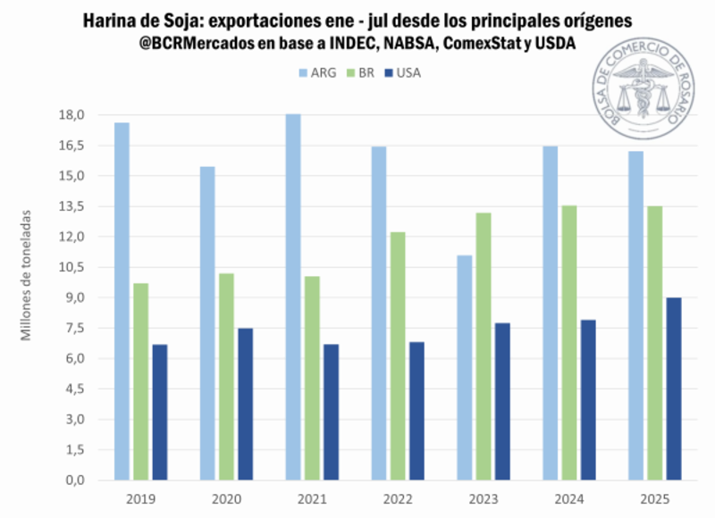 Mientras en Argentina la producción se estanca, el saldo exportable de harina de soja estadounidense viene aumentando año tras año, hasta alcanzar las 9 millones de toneladas entre enero y julio, un récord absoluto.