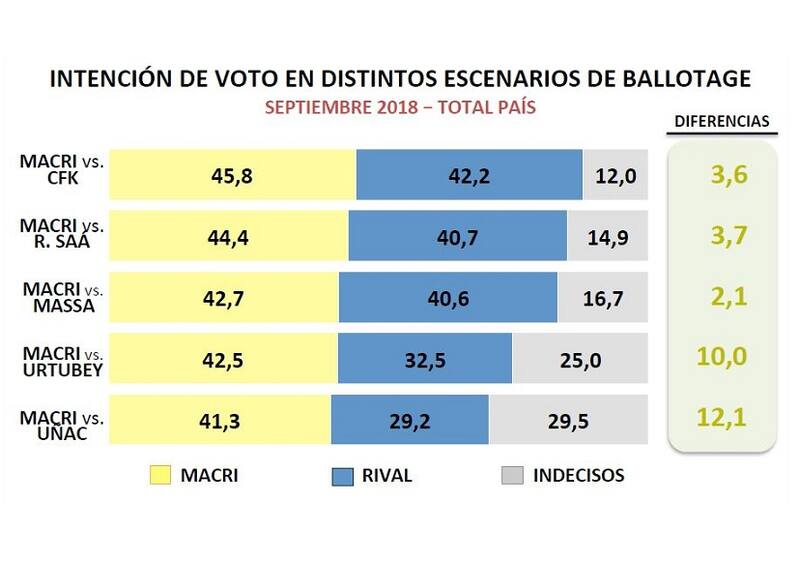 De acuerdo al relevamiento realizado entre 1143 personas en CABA y el interior del país los días 7 y 8 de septiembre, frente a diferentes escenarios de ballotage, Macri sigue teniendo más intención de voto que los dirigentes opositores relevados, si no se contabilizan los indecisos, que totalizan el 15% de los encuestados.