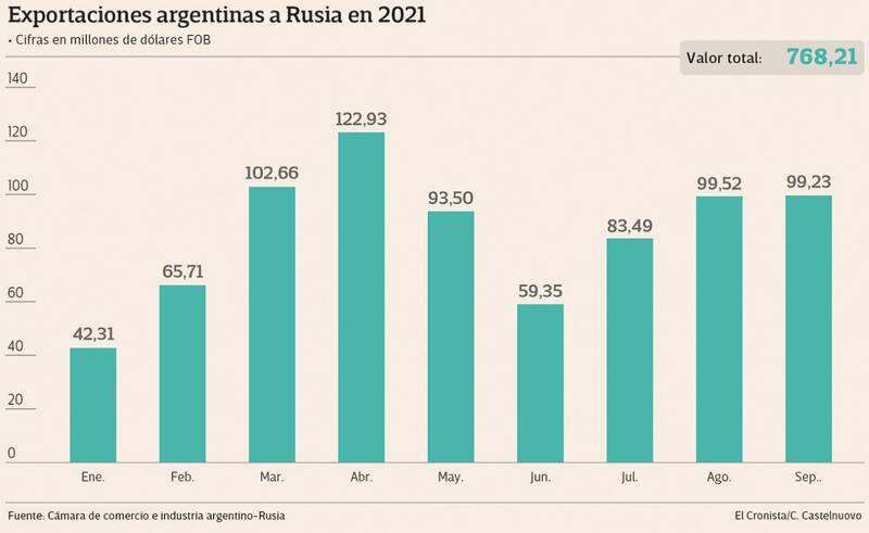 Según un informe de la Cámara de Comercio e Industria Argentino-Rusa al que accedió El Cronista, en septiembre de 2021 las exportaciones de la Argentina a Rusia eran de 99.230.236 millones de dólares mientras que en septiembre pasado las exportaciones argentinas a Moscú fueron de 53.333.723 millones de dólares.