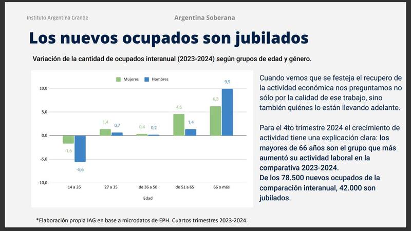 Si bien la base de ocupados en la comparativa interanual creció en 78.000 personas, el informe del Instituto Argentina Grande (IAG), devela un dato que alarma: los mayores de 66 años son el grupo que más aumentó su actividad laboral en la comparativa 2023-2024.