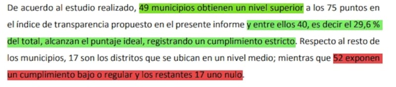 Entonces, da 30 puntos si está publicado el Presupuesto del ejercicio corriente; 35 por la publicación de la Situación Económico-Financiera trimestral con un mes de rezago como máximo; 10 puntos por la publicación de la ejecución presupuestaria trimestral; 10 por la publicación de la ejecución trimestral de Gastos, 10 por la publicación trimestral del Stock de Deuda pública y sus perfiles de vencimientos; y 5 puntos por premio a la transparencia.
