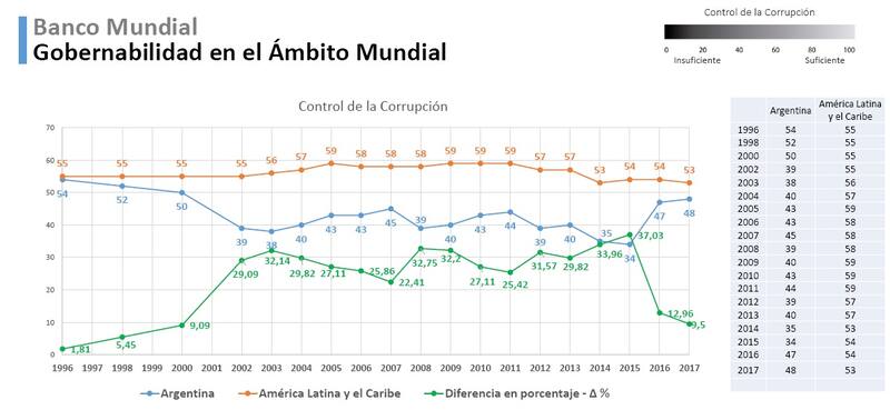 El informe de la Universidad Austral también toma datos de otros organismos. Por ejemplo, del Banco Mundial, que analiza la gobernabilidad a nivel internacional. En este caso, hay una mejora argentina en el índice “Estado de derecho : tras tocar un piso en 2014, en 2017 se alcanzó el valor más alto desde el año 2000. Si bien se ubica por debajo del promedio latinoamericano, la brecha se redujo de un 62 a un 8% entre esos años.