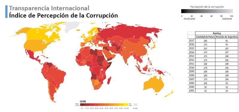 Igualmente, también según Transparencia Internacional mejoró levemente en los últimos dos años la posición relativa de Argentina en comparación al resto de los países. Mientras que en 2015 se ubicaba en el puesto 107 sobre 167 países, en 2017 trepó al lugar 85 entre 180.