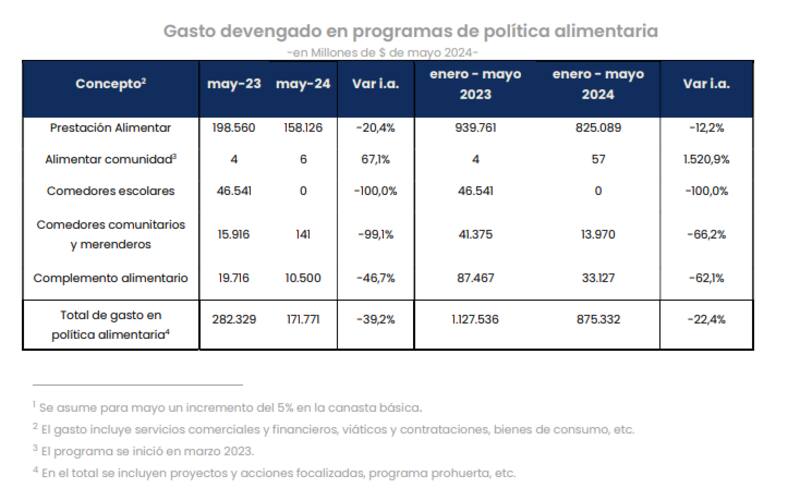 En donde se destacó lo que sucedió con las políticas alimentarias, que el 94,3% del gasto lo representa la tarjeta Alimentar. "En mayo tuvieron una caída del 20,4% interanual real, y en lo que va del año disminuyeron un 12,2% interanual", alertaron en el informe.