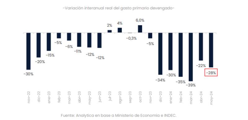 En términos totales, en mayo, el gasto primario real devengado habría sufrido una caída interanual del 27,9%, que lo llevó a sumar en el acumulado desde enero una pérdida del 31,4% en comparación con los mismos meses del 2023.