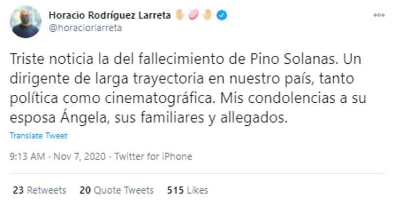 En tanto, el jefe de Gobierno porteño, Horacio Rodríguez Larreta, expresó: "Triste noticia la del fallecimiento de Pino Solanas. Un dirigente de larga trayectoria en nuestro país, tanto política como cinematográfica. Mis condolencias a su esposa Ángela, sus familiares y allegados".
