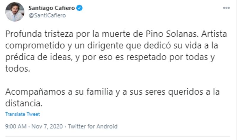 "Profunda tristeza por la muerte de Pino Solanas. Artista comprometido y un dirigente que dedicó su vida a la prédica de ideas, y por eso es respetado por todas y todos. Acompañamos a su familia y a sus seres queridos a la distancia", escribió el jefe de Gabinete, Santiago Cafiero, en su cuenta de Twitter.