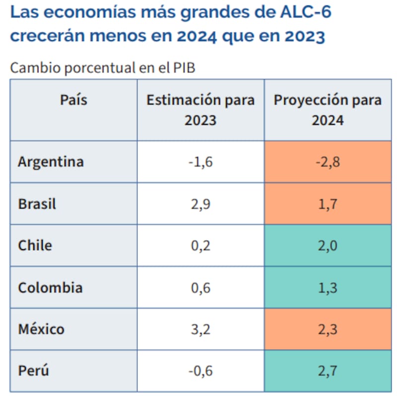 De hecho, en las 6 economías más importantes de América Latina (salvo Argentina), todas se prevén que crezcan, pero menos que en 2023. Para Brasil proyectan + 1,7%, Chile +2%, Colombia +1,3%, México +2,3% y Perú +2,7%.