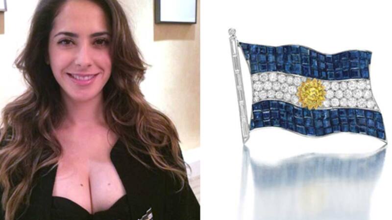 Fue promocionada como una de las Magnificent Jewels –joyas magníficas– que destacó la casa de remates millonarios en su catálogo, en el que incluyó el valor histórico de la pieza y la exquisita técnica con la que fue armada para simular el flamear de la bandera argentina sin que se perciban los engarces. Toda una obra de arte.