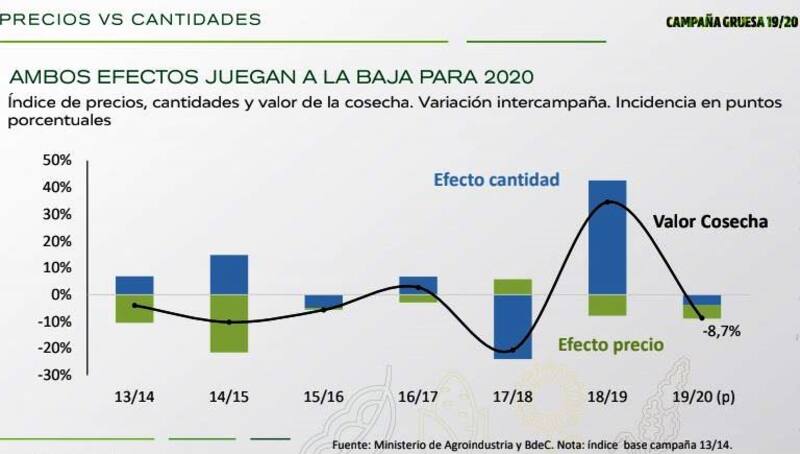 En ese sentido, apuntan a que el Valor Bruto de la campaña caerá 5% internual, o u$s 4140 millones; la inversión se contraerá 8,6%; el Producto Bruto Agrícola bajará 6,8%; las exportaciones descenderán 8%, a u$s 2390 millones; por lo que la recaudación por retenciones bajaría 12%.