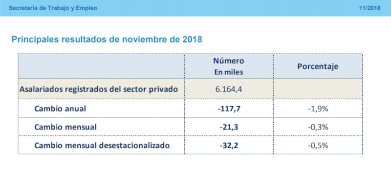 En noviembre de 2018 el sector privado argentino registró en su totalidad 6.164.448 empleos formales, una cifra 1,9% menor que la del mismo mes de 2017. En términos absolutos representa una pérdida de 117.736 puestos de trabajo.