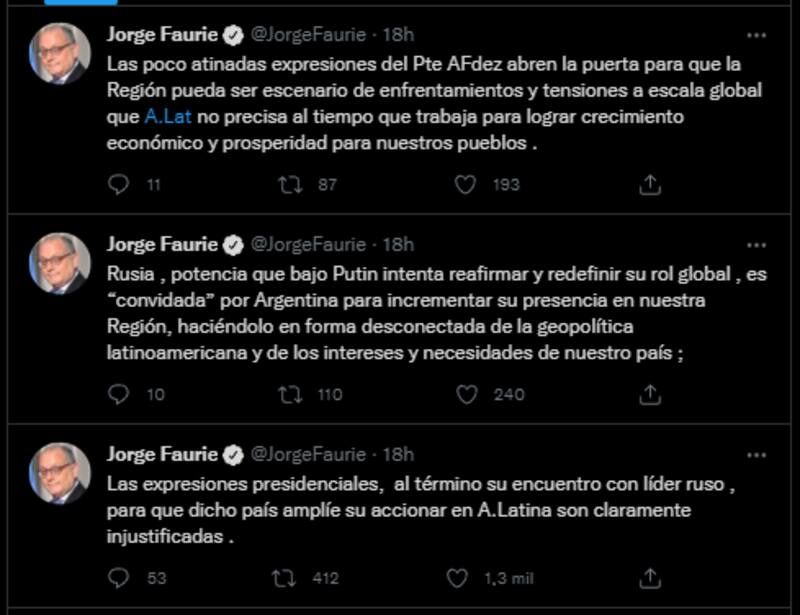 Asimismo, Faurie criticó que el mandatario haya planteado que Rusia debía fortalecer su presencia en América Latina: "Rusia, potencia que bajo Putin intenta reafirmar y redefinir su rol global, es `convidada´ por la Argentina para incrementar su presencia en nuestra región, haciéndolo en forma desconectada de la geopolítica latinoamericana y de los intereses y necesidades de nuestro país".