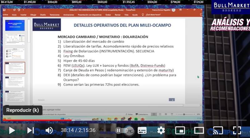 El economista Mauro Mazza, responsable del área de research de Bull Market, expresó allí que "si gana Milei en primera vuelta, los días lunes, martes y miércoles serán terribles". También señaló que podría ser necesario llevar a cabo reuniones de transición y que este evento podría marcar el rumbo del mercado durante la próxima década debido a la magnitud de la devaluación que se podría experimentar.