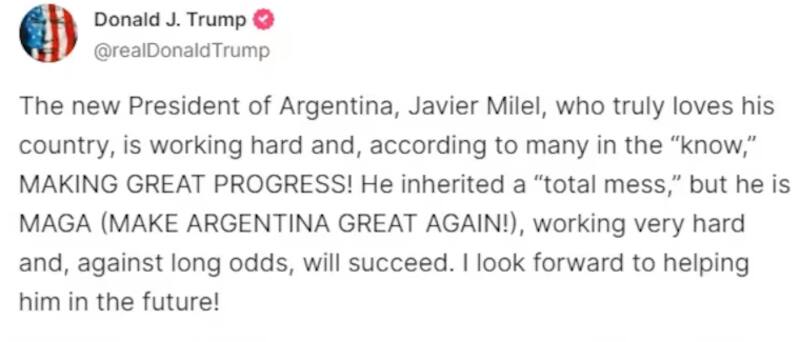 "El nuevo presidente de la Argentina, Javier Milei, quien realmente ama a su país, está trabajando duro según muchos conocedores, haciendo un gran progreso", planteó Trump a través de Truth Social, donde tiene 6 millones y medio de seguidores.
