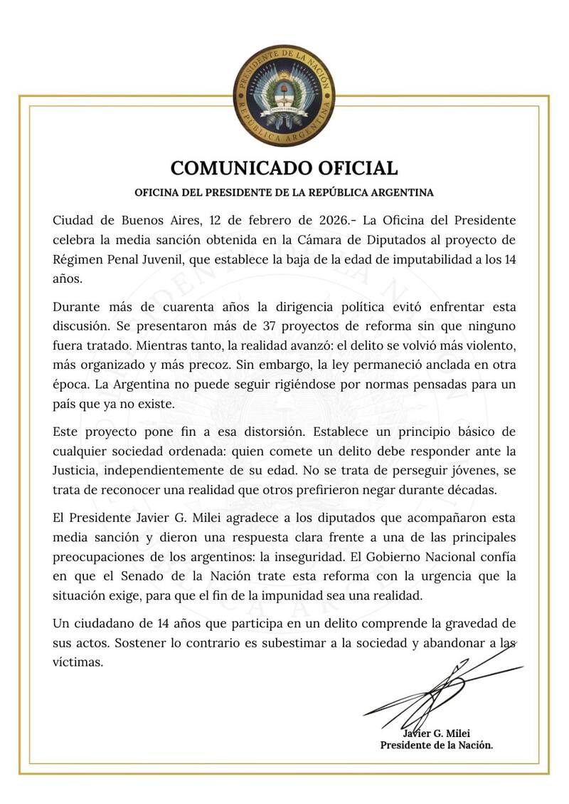 Luego de esa votación, el Gobierno destacó la iniciativa a través de un comunicado de la Oficina del Presidente, en el que sostuvo que la reforma puso fin a una discusión que la dirigencia política evitó durante más de 40 años. Según el texto, durante ese período se presentaron más de 37 proyectos sin tratamiento y el régimen vigente permaneció “anclado en otra época”, mientras el delito juvenil se volvió más violento y organizado.