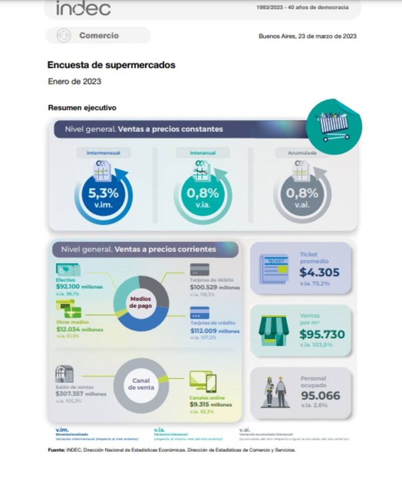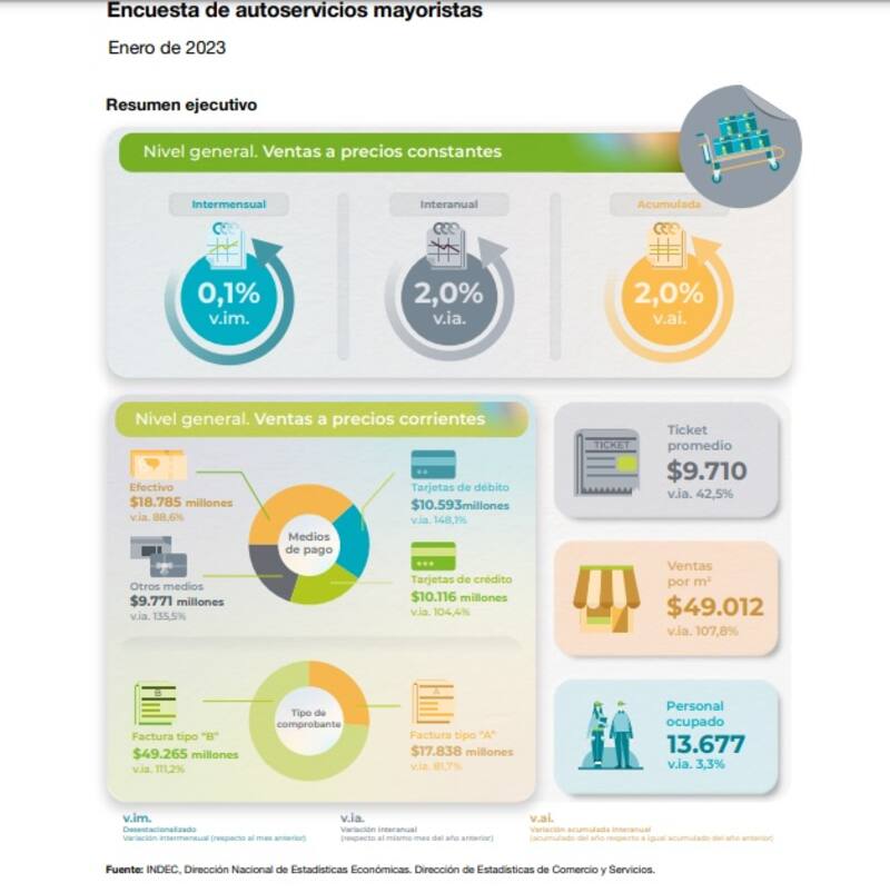 En tanto, en los autoservicios mayoristas el crecimiento fue del 2% en el cotejo interanual, mientras que frente a diciembre pasado marcó una baja de 0,1%.