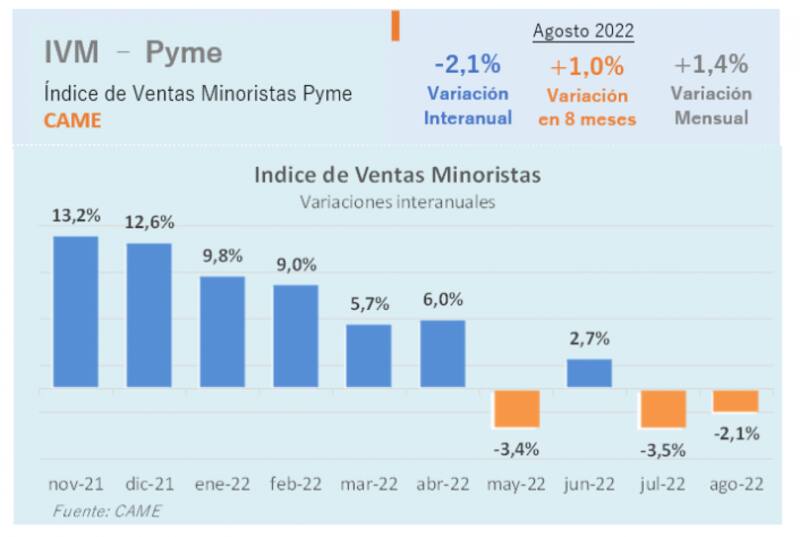 Como corolario de la alta incertidumbre que marcó julio y el "shock de precios", las ventas minoristas volvieron a mostrar un retroceso en el mes de agosto de 2,1 % luego de caer 3,5% en julio y marcaron la segunda baja en lo va del 2022, según el relevamiento que realiza la Confederación Argentina de la Mediana Empresa (Came).