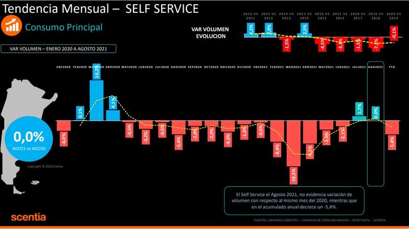 Según datos de la consultora Scentia, en agosto de 2021 "el Self Service (suma de supermercados y autoservicios independientes) no evidencia variación de volumen con respecto al mismo mes del 2020, mientras que en el acumulado anual decrece un -5,4%".