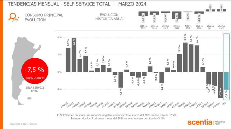 En el dato de self service total, que reúne lo ocurrido en supermercados y almacenes de cercanía, la caída interanual fue del 7,5%, la más alta del año, En el acumulado del primer trimestre, la baja es de 5,1%. En el gráfico de la evolución histórica anual se observa que 2024 podría ser la primera caída después de 3 años, dado que en 2022 y 2023 hubo aumentos en las ventas. La última caída fue en 2021, del 2,1%.