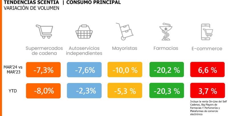 Con los datos de marzo que relevó Scentia se observa que la caída acumulada en el primer trimestre es de 8% en supermercados, 2,3% en autoservicios, 5,3% en mayoristas y 20,3% en farmacias. El volumen de ventas en medicamentos cayó 4,3% interanual en marzo, y acumula en lo que va del año una baja del 3,2%.
