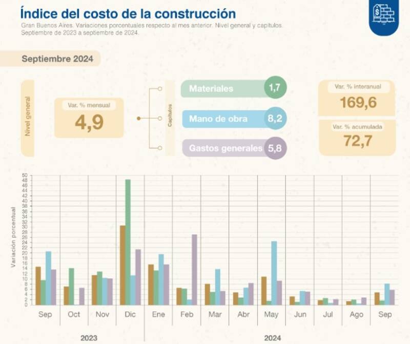 El Instituto Nacional de Estadística y Censos (INDEC) dio a conocer este jueves el índice de costo de la construcción, que subió 4,9% en septiembre de 2024 respecto de agosto y alcanzó una variación del 169,6% interanual.
