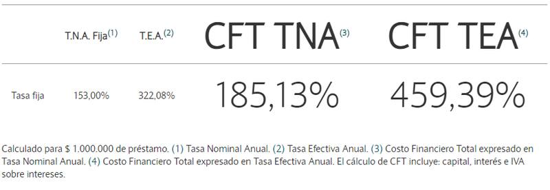 La tasa de interés para usuarios que no adhieran al paquete de servicios "Cuenta Nación" (calculado para $ 1.000.000 de préstamo) es la siguiente: