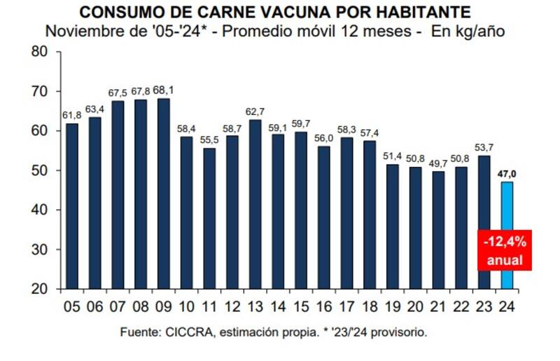 Según datos de la Cámara de la Industria y Comercio de Carnes (CICCRA), el consumo de carne aparente por habitante entre enero y noviembre de 2024 fue de 47,4 kilos/año, 11,1% abajo del promedio de enero-noviembre de 2023 (-5,9 kg/hab/año). El promedio móvil de doce meses hasta noviembre de 2024 habría quedado en 47 kg por habitante al año, registrando una baja de 12,4% interanual (-6,6 kg/hab/año) y su menor nivel al menos desde 2005.