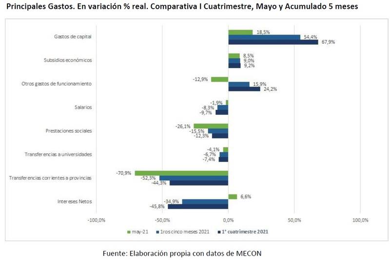 Por el lado de los gastos, las partidas más robustas se deterioraron respecto a la inflación interanual de 48,8%. Las prestaciones sociales crecieron solo un 10% respecto a mayo de 2020, debido a que en aquel mes la asistencia por la cuarentena era mucho mayor con el Ingreso Familiar de Emergencia (IFE).