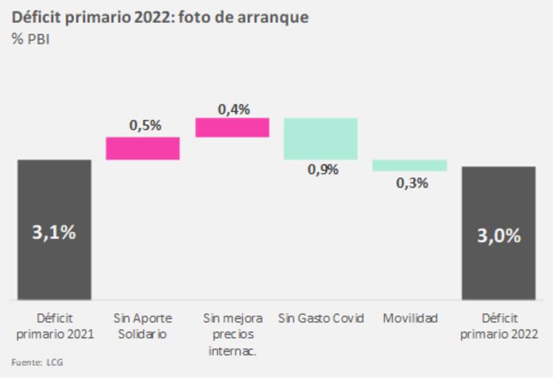 LCG remarca que "sin contar con los otros ingresos extraordinarios (no presupuestados originariamente) con los que el Tesoro se hizo este año-Aporte Solidario y aumento de la recaudación por la mejora de los precios internacionales-, el rojo de arranque en 2022 sería de 4% del PBI".
