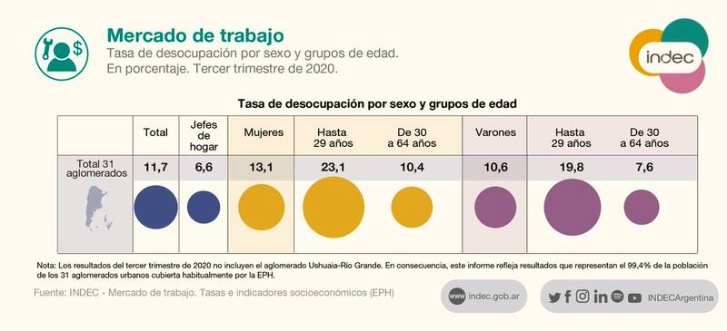 El desempleo afectó al cierre del tercer trimestre al 11,7% de la población, informó el Instituto Nacional de Estadísticas y Censos (Indec), y alcanzaba entonces a 2,23 millones de personas a partir de las proyecciones que se desprenden del estudio, lo que significa un alza de dos puntos porcentuales en la comparación interanual.