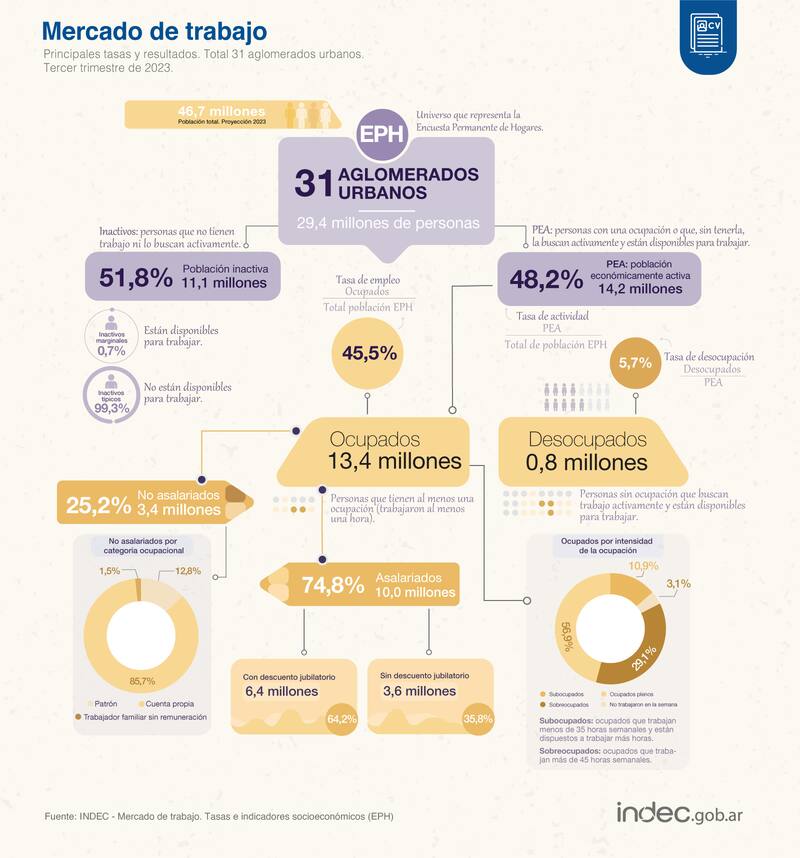 El INDEC precisó también que la tasa de desocupación fue superior en mujeres, con un 6,3%, frente a los hombres, que se situó en un 5,3%. Además, la región del Gran Buenos Aires fue la más afectada con respecto a la desocupación, con un 6,2%, seguido por la Pampeana, con un 6,1%.