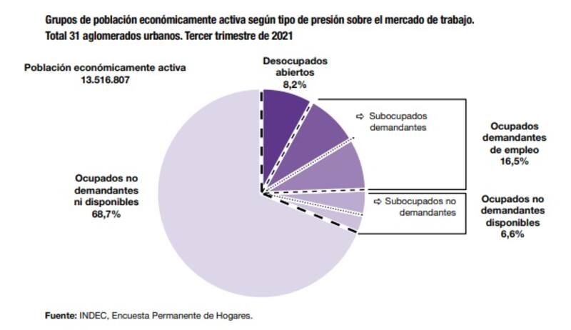Los subocupados por su parte, aquellas personas que trabajan menos de 35 horas semanales y están dispuestos a hacerlo por más tiempo, llegan al 13,3% de la población económicamente activa. Serían casi 1,8 millones de personas tomando la EPH pero trepando a 2.795.000 considerando la población total.