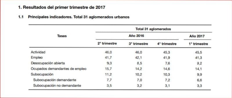 Según el informe "los resultados del primer trimestre de 2017 no presentan diferencias estadísticamente significativas en la actividad y el empleo con relación al trimestre anterior" mientras que "la tasa de desocupación presenta un incremento estadísticamente significativo".