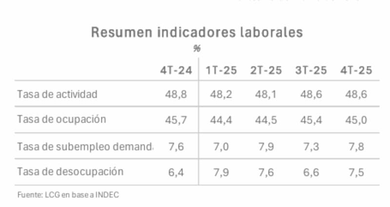 Un informe de la consultora LCG también dio cuenta de un deterioro general del mercado laboral hacia el cierre de 2025, en línea con los datos oficiales. “Los indicadores del mercado de trabajo mostraron un empeoramiento general respecto a un año atrás y contra el trimestre anterior”, señaló la firma en su último reporte.