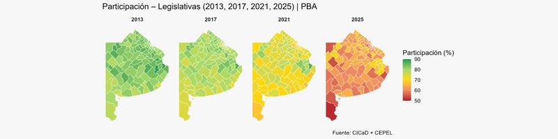 Los mapas comparativos de las elecciones legislativas de 2013, 2017, 2021 y 2025 muestran un cambio de color evidente: de un verde uniforme (alta participación) se pasó en 2025 a un predominio de amarillos y rojos, que evidencian el retiro de los votantes de las urnas.