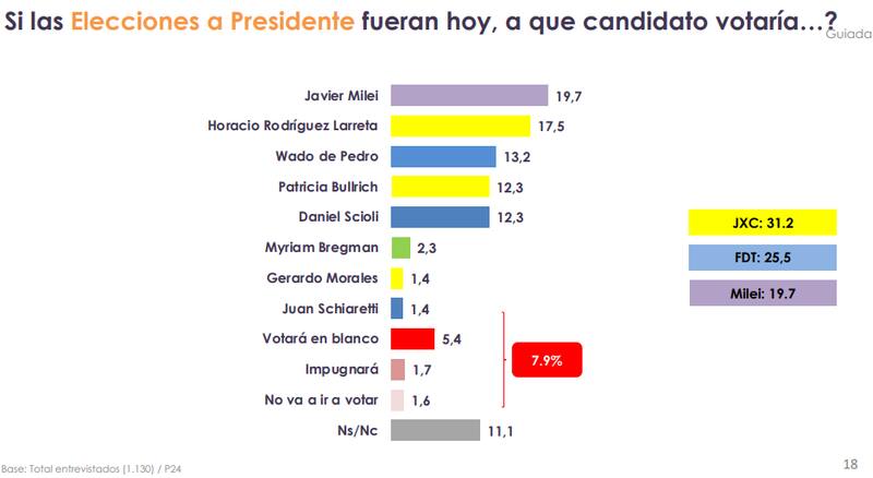 Es que, de acuerdo al estudio, si las elecciones a presidente fueran hoy, Milei quedaría en primer puesto, con el 19,7% de los votos. Mientras que Larreta se ubicaría en un segundo lugar con el 17,5%.