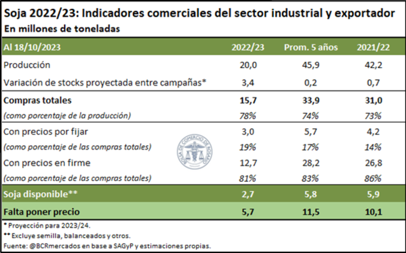 En este magro escenario, al 18 de octubre, las ventas de la oleaginosa tanto a la industria como a la exportación totalizaban 15,7 Mt, el equivalente al 78% de la cosecha total (2022/23), por encima al nivel alcanzado en igual período del año anterior, cuando se había comercializado el 73% de la cosecha, y al promedio de las últimos 5 campañas de 74%.