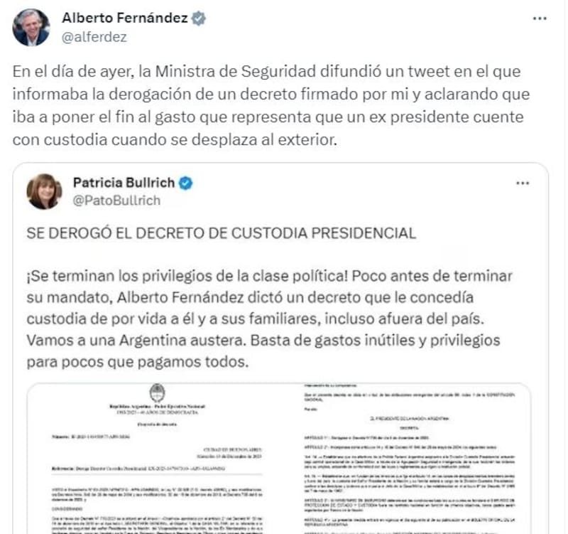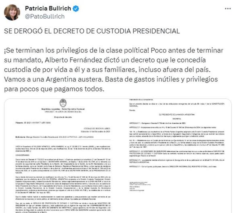 "Poco antes de terminar su mandato, Alberto Fernández dictó un decreto que le concedía custodia de por vida a él y a sus familiares, incluso afuera del país", expresó Bullrich en su cuenta de X (exTwitter). Horas más tarde, eliminó la publicación.
