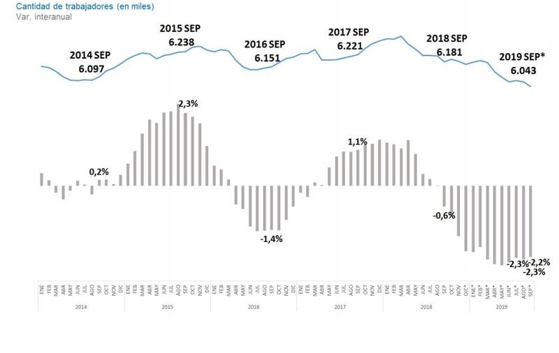 La cantidad de trabajadores registrados del sector privadose retrajo un 2,2% interanual en septiembre y cayó un 0,4% con respecto al nivel de agosto, informó la Secretaría de Trabajo en su informe mensual, con lo que quedó en 6.043.000, su nivel más bajo desde diciembre de 2012.