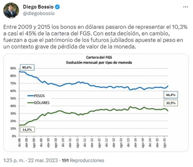 Para el ex Director de ANSES, Diego Bossio, el organismo se desprende de los bonos en dólares "que serán entregados a los bancos y ANSES se queda con nuevos títulos pero no se sabe de qué calidad". Y recordó que "la acumulación de deuda pública en dólares fue clave para que el FGS atravesara las recurrentes devaluaciones sin dañar su patrimonio".