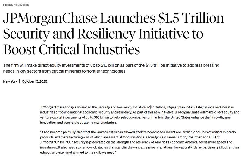 "Ha quedado dolorosamente claro que Estados Unidos se ha vuelto demasiado dependiente de fuentes poco fiables de minerales, productos y manufacturas esenciales para nuestra seguridad nacional", expuso el propio Dimon.