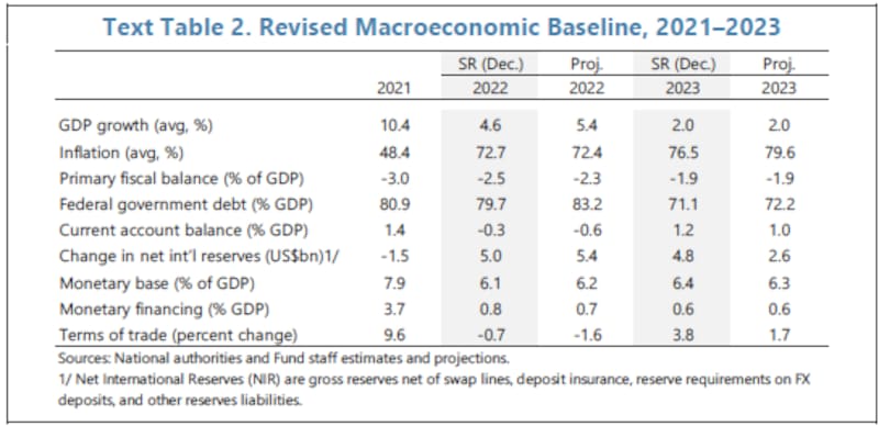 Las proyecciones del Fondo sobre la inflación promedio en 2023 crecieron de 76,5% hasta el 79,6%, lo que implica la primera admisión registrada oficialmente de que la evolución de los precios superará este año largamente el 60% (punta a punta). Hasta el momento, la proyección oficial es que la inflación tendría un techo del 65%.