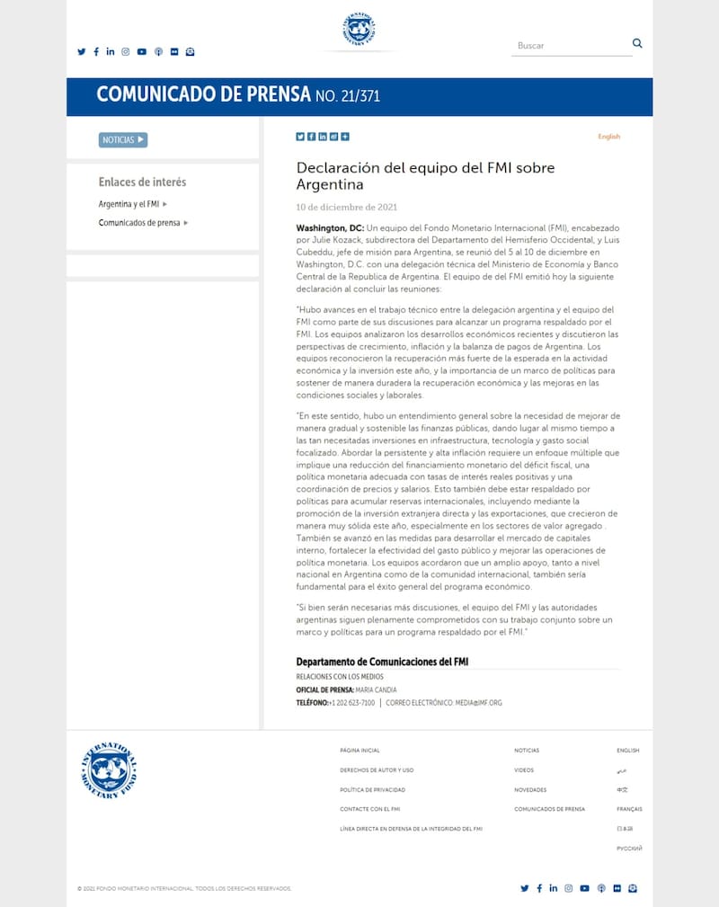El equipo del Fondo estuvo encabezado por Julie Kozack, subdirectora del Departamento del Hemisferio Occidental, y Luis Cubeddu, jefe de misión para Argentina, y emitió el comunicado luego de intensas reuniones del 5 al 10 de diciembre en Washington D.C., con la misión técnica argentina del Ministerio de Economía y el Banco Central de la Republica de Argentina (BCRA).