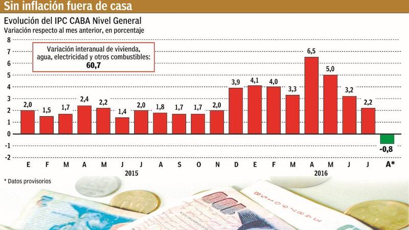 Por el freno al aumento del gas por parte de la Justicia, el IPC en la Ciudad de Buenos Aires mostró deflación: en agosto disminuyó un 0,8% en comparación con julio. El rubro vivienda, agua, electricidad y otros combustibles, que es donde se engloba a las tarifas, registró una baja de 9,5% en un mes, producto del fallo de la Corte Suprema por el gas. De todos modos, este ítem en los últimos 12 meses creció fuerte, un 60,7%, porcentaje que se incrementará desde octubre cuando el Gobierno ponga en práctica el nuevo cuadro tarifario que presentará el viernes en la audiencia pública.