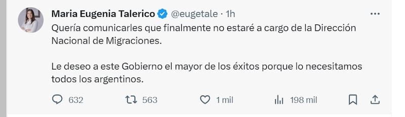"Quería comunicarles que finalmente no estaré a cargo de la Dirección Nacional de Migraciones. Le deseo a este Gobierno el mayor de los éxitos porque lo necesitamos todos los argentinos", publicó a través de su cuenta de X (ex Twitter). Al momento, no se definió quien la reemplazará.